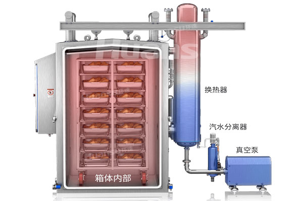 環(huán)速科技的設(shè)備能夠在8-18分鐘內(nèi)將肉食從高溫降到10℃以下(因食材而定)。該設(shè)備真空冷卻的原理是通過改變密閉冷卻室內(nèi)的壓力,來降低水的沸點(diǎn),使其形成水蒸氣并隨著抽真空排出,帶走待冷卻肉類食品的熱量,達(dá)到降溫冷卻的目的。
