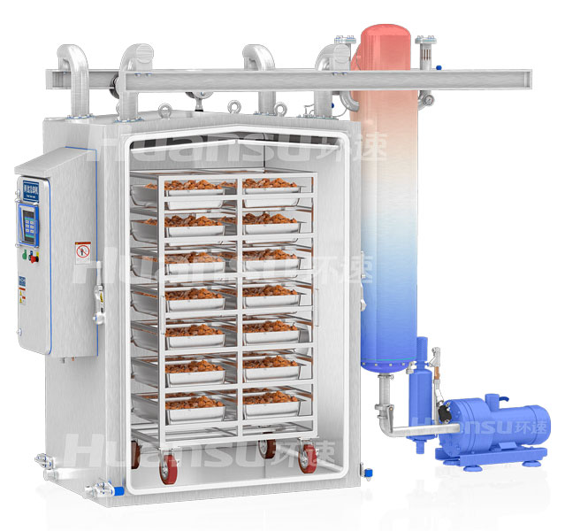 在食品加工工藝中,食品冷卻是十分重要的中間環(huán)節(jié),它承上啟下,銜接上游的熱加工與下游的包裝、物流兩個(gè)階段??梢哉f(shuō),食品冷卻的快慢,直接影響整個(gè)生產(chǎn)流程的效率,以及產(chǎn)品的品質(zhì)控制。因?yàn)樵诮^大多數(shù)的生產(chǎn)工藝中,高溫食品是不能直接包裝的,否則持續(xù)的高溫會(huì)影響食品的品質(zhì),并且熱量變化也會(huì)導(dǎo)致包裝鼓脹、內(nèi)縮等問(wèn)題,需要耐心等待食品的溫度降下來(lái),才能進(jìn)行下一步的處理;為了加快降溫,食物需要放在通風(fēng)處,借助空氣的流動(dòng)加快熱交換,不少弊端伴生而來(lái):如空氣質(zhì)量不佳引起食品污染,水分散失導(dǎo)致食物外觀變化,食品表面氧化變色等問(wèn)題……出于生產(chǎn)效率與食品安全的考慮,食品冷卻既要保證降溫迅速,又要兼顧衛(wèi)生,這便將風(fēng)冷、冷庫(kù)等一眾常規(guī)的方式排除在外了,因?yàn)樗鼈兓蚨即嬖谒俣嚷?、外冷?nèi)熱、有衛(wèi)生隱患等短板。相比之下,真空冷卻則是一種相對(duì)理想的方案。