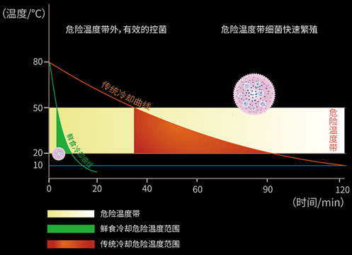 環(huán)速真空冷卻機(jī),相比傳統(tǒng)的風(fēng)冷、水冷、冷庫(kù)等方式,具有高效、節(jié)能、衛(wèi)生的顯著優(yōu)勢(shì)。它可以快速將高溫食品降至常溫或更低的溫度,根據(jù)食材種類的不同,耗時(shí)控制在3-18Min之內(nèi),效率及產(chǎn)能有了根本的保障;整個(gè)冷卻過(guò)程均在密閉的真空環(huán)境中進(jìn)行,只需利用食品自身所含有的水分充當(dāng)媒介,無(wú)需額外的制冷手段,因此避免了食品與外部環(huán)境的接觸,杜絕了外源污染;快速冷卻使食品避開微生物繁殖活躍期,從而得以延長(zhǎng)食品的保鮮期。