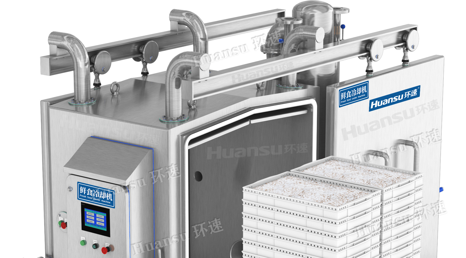 鮮食冷卻機(jī)通過水環(huán)泵、蒸汽射流和高效率換熱器的三級抽真空形式,實(shí)現(xiàn)了快速、高效率、節(jié)能的真空系統(tǒng),能用較低的能源使真空室內(nèi)快速達(dá)到真空狀態(tài),使食品內(nèi)的熱量可以短時(shí)間內(nèi)釋放出來,實(shí)現(xiàn)了節(jié)能低耗的效果。歐洲IP69K衛(wèi)生等級隔離艙,增加了設(shè)備的衛(wèi)生等級,避免了食品在真空箱內(nèi)被二次污染的可能性。