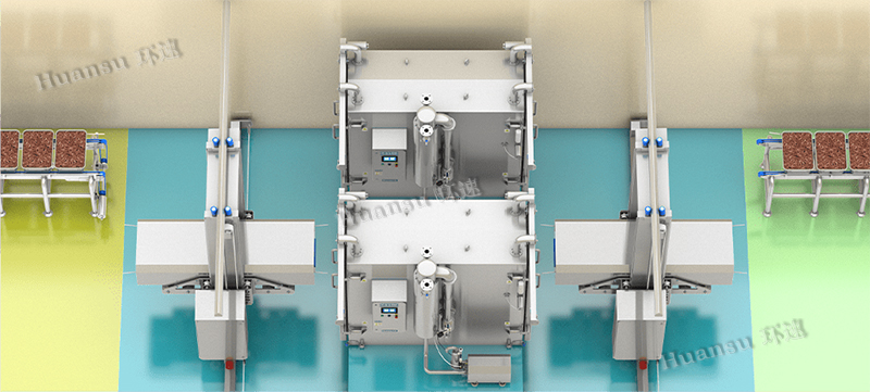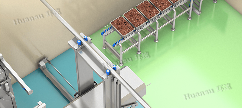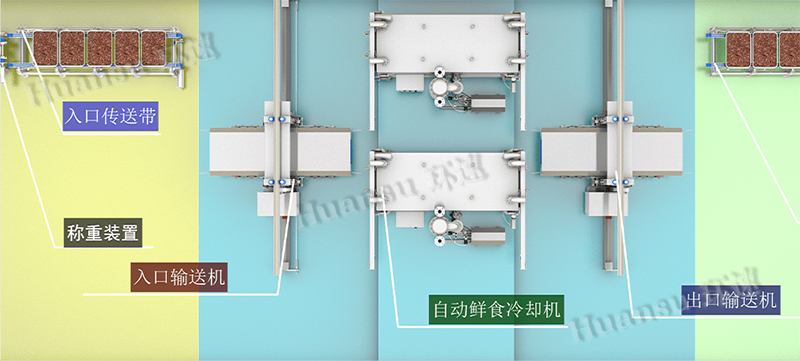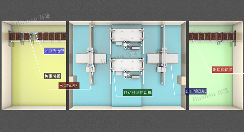 FAC鮮食自動冷卻線可以和客戶現(xiàn)場的原有輸送裝置相對接,實現(xiàn)了高效率且無人的自動冷卻加工目標。節(jié)省用戶生產車間面積,提高用戶產能,降低由人工帶來的污染可能性和不確定性,提升了產品生產的穩(wěn)定度,而且能夠實現(xiàn)24小時不間斷生產。
